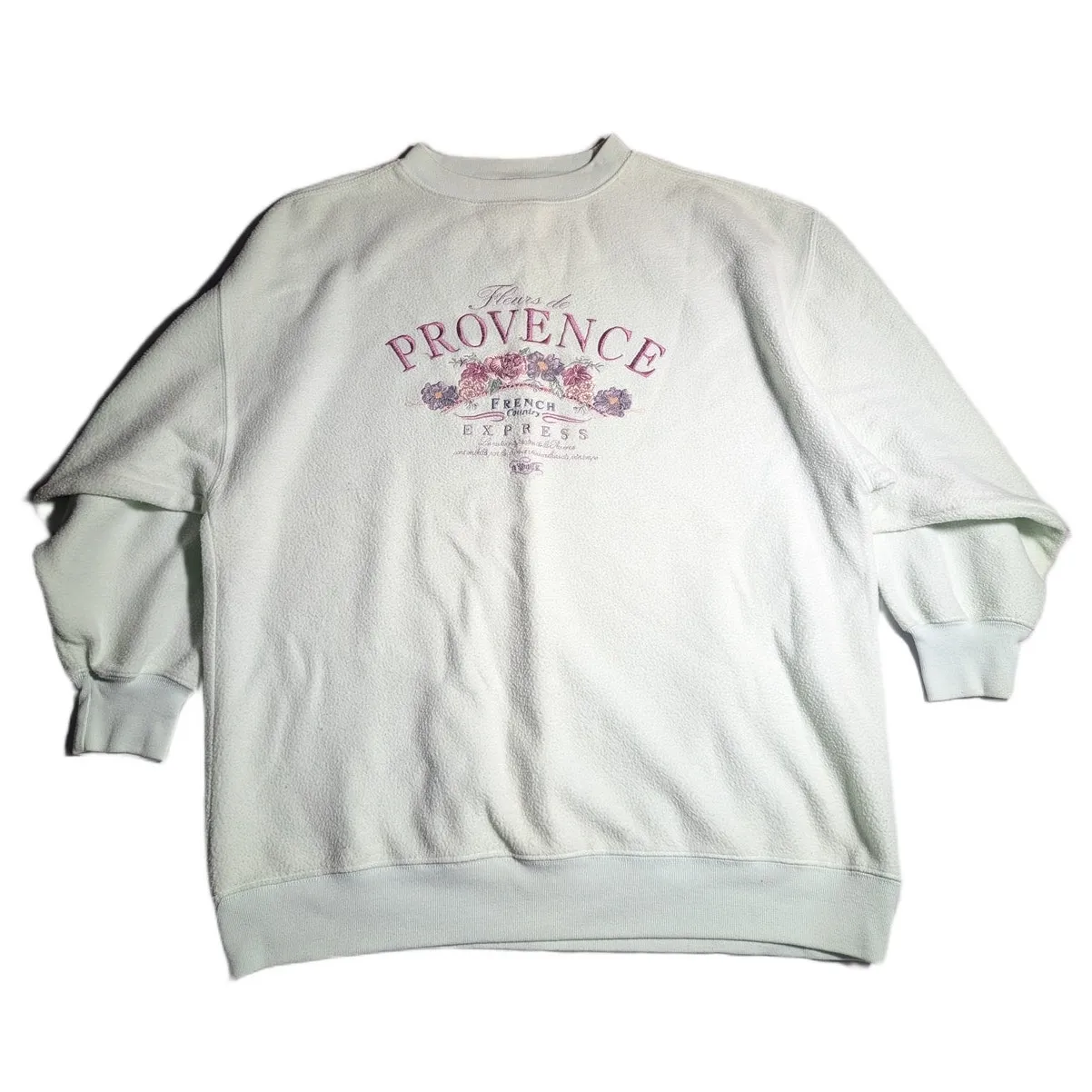 Pale green fleece crew neck pullover sweatshirt with Provence and floral embroidery, from Express. Vintage circa the 1990s. Excellent gently used condition. Oversized fit. Bust: 23" flat Length: 27"