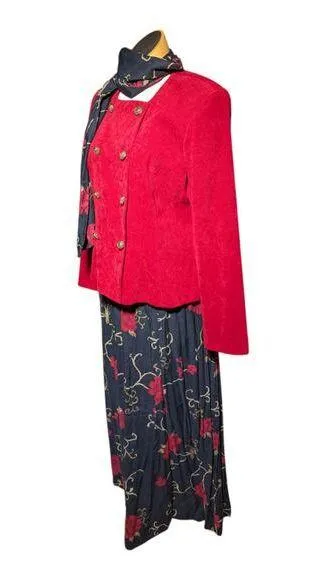 Red chenille double-breasted button up blazer jacket and black elastic waist rose floral print maxi skirt set with a scarf that matches the skirt, from Positive Attitude. Vintage circa the 1990s. Excellent gently used condition. Bust: 17" flat Jacket length: 22.5" Waist: 14" flat Skirt length: 37"