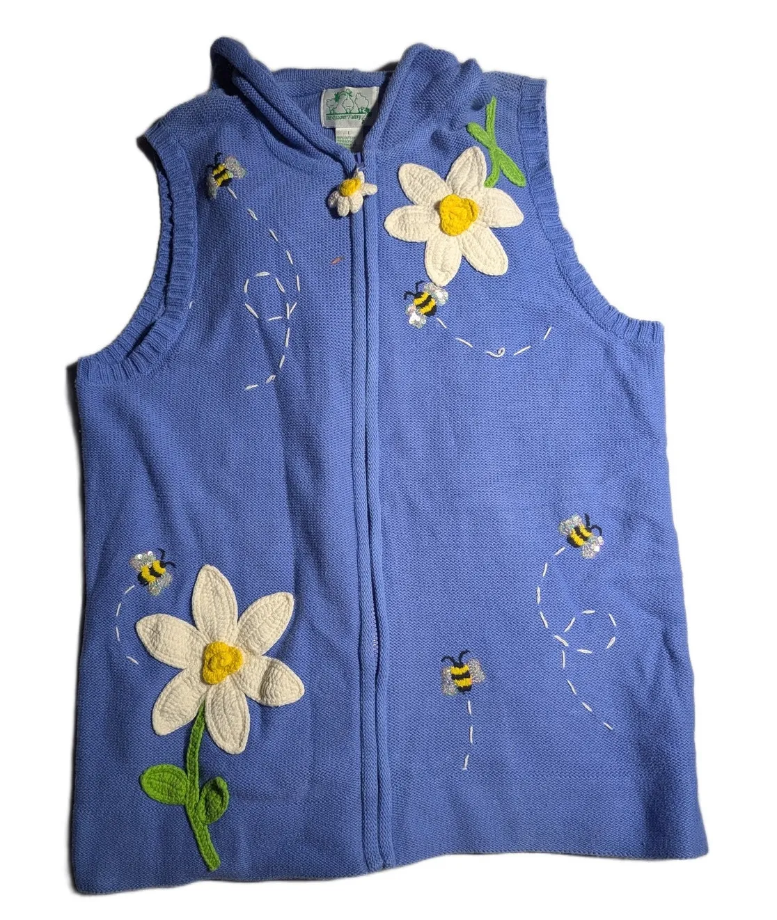 Blue cotton blend knit hooded full zip vest with embroidered daisy flowers and bees, from Quacker Factory. Vintage circa the 1990s. Excellent gently used condition. Bust: 20" flat Length: 26"
