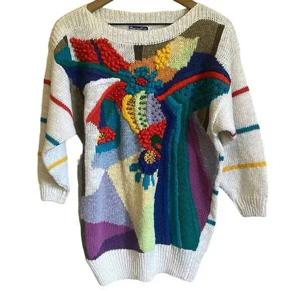 Vtg 3D Knit Sweater Sz Small Beaded Multicolor Funky Rad 80s 90s Maximalist Brand: Marieakim Excellent condition. No flaws Pit to pit 20” Length 28.5” Sleeve length 17” Same day shipping subculture vintage aestheti lo-fi thriftcore 80’s 90’s dazecore geometric dad sweater norm thompson escape the ordinary 3D knit, funky, art to wear, artsy, colorful, wacky, unique, avant garde, maximalist, eclectic, dopamine dressing, kitschy, Dark academia, goblincore, Vintage, retro, colorblock, grandpacore, antique, mid century modern, mcm, old school, nostalgia, nostalgic, oversized, muted, cozy, funky, art to wear, artsy, colorful, wacky, bold, patterned, embellished, unique, avant garde, maximalist, eclectic, dopamine dressing, kitschy, art teacher, creative, unconventional, artisanal, artisan, quirky, pattern,