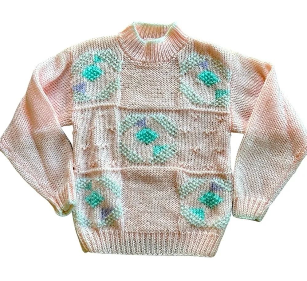 VTG 80’S Knit Sweater Sz M Pastel Pink Fuzzy Snowflake Mock Neck Chunky Nordic *Please note the side of the mock neck has been repaired.. see last pic Mock neck Crochet/knit front block Snowflake/metallic threads Chunky knit Bust: 38” stretchy Length: 24” Sleeve: 23” wrist Free of stains/holes/repaired see last pic From a smoke free home