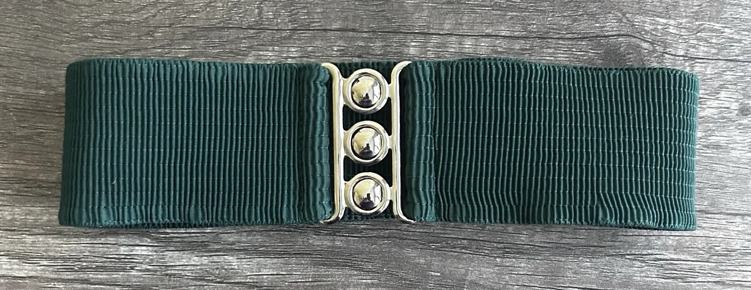 VTG 80s Malco Modes Belt XL Green Wide Elastic Cinch Metal Buckle Square Dance Great Pre-Owned Condition - See Pictures for Details Features: -Wide stretchy elastic for bold waist definition -Metallic triple-ball clasp for retro impact -Dark Green tone -Perfect 80s revival accessory or costume touch -36" long unstretched Style Profile: 80s, retro, bold, vintage glam, maximalist, novelty, disco, waist-accenting, cosplay, costume, dance accessory, theme party Pet/ smoke free home 1-2 day shipping Bundle & Save 80sStyle, RetroFashion, StatementBelt, VintageVibes