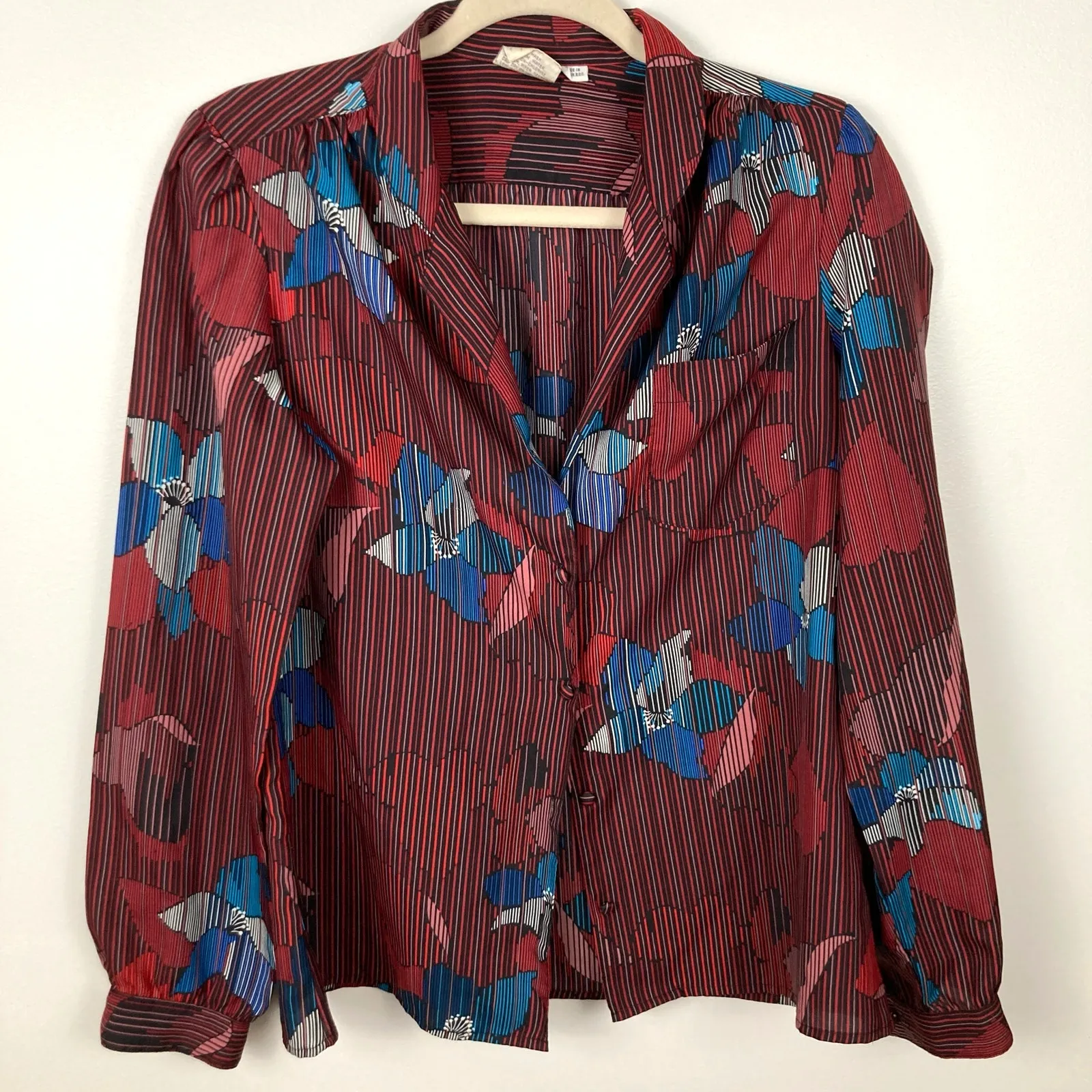 Good gently used condition, with top button missing (see pics for additional details). No size or materials tag. Likely a lightweight polyester. Style tags: 1980s, button cuff, retro, statement, art teacher, patterned button down, whimsical, office, career, pinstripe, academia, drapey, art to wear, artsy, bold print Estimated at a modern M based on measurements. Please check measurements against an item you currently own! Flat measurements (approximate) Length: 23.5" Pit-to-pit: 20" Sleeve: 23.5" Smoke-free, pet-friendly home. Items are steamed before storage.