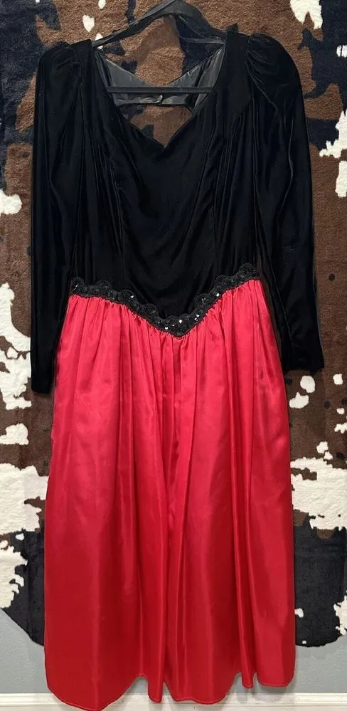 This vintage 1980s Scott McClintock dress in size 10 features a long sleeve velvet top with a sweetheart neckline and a black sequin lace detail. The dress is made of red silk and offers a whimsical gothic Victorian style, perfect for formal occasions such as parties, winter balls, or weddings. The fit and flare silhouette, along with the combination of black and red colors, adds a touch of alternative, punk, and Steampunk vibes to the outfit, making it a unique and standout piece for those seeking a dark and romantic aesthetic. Item is pre owned and vintage in good condition. Please view photos for size measurements and condition. Dress length is 50" from shoulder to bottom. Sizing may be different to today’s sizing . Please view all photos .