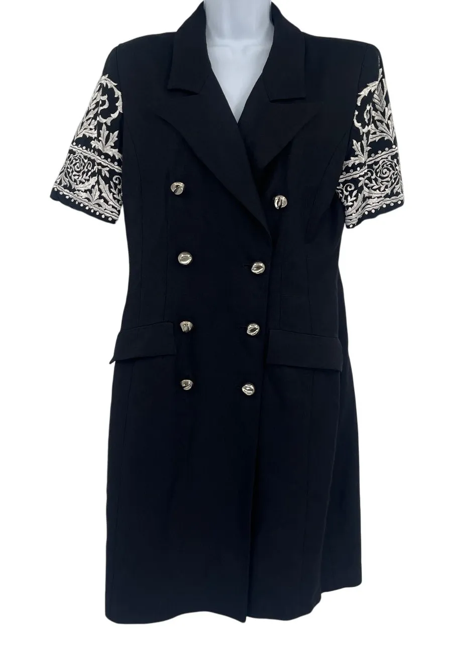 Vintage Richard Warren Black Embroidered Sleeve Dress 80s 90s Double Breasted 10 V-neck, Double brea... Show more