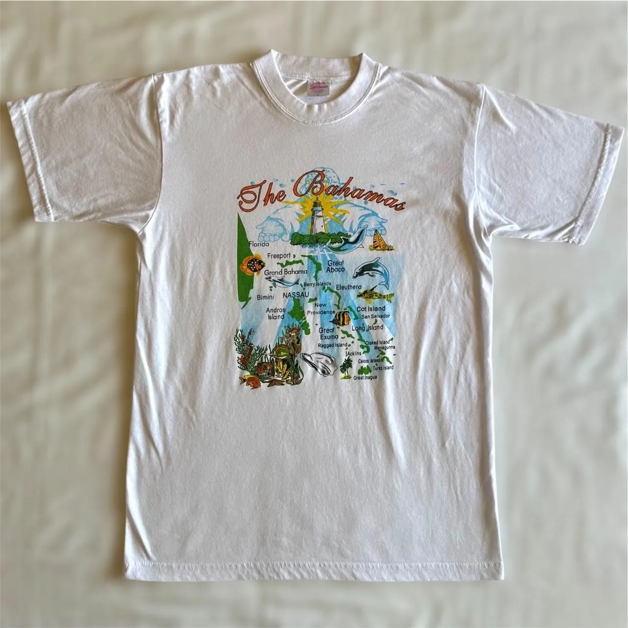 dorsett sportwear vintage 90s white bahamas short sleeve graphic tee, size small super cute vibrant design showing the islands in very good condition, no noticeable flaws MEASUREMENTS: pit to pit 18.5in flat across, length 26.5in #90svintage #2000svintage #bahamas #graphictee #tshirt