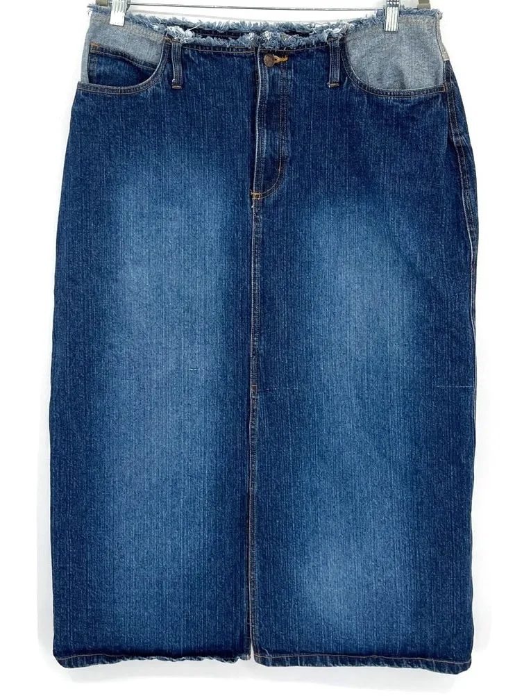 Dark wash Vintage 90s Bill Blass Maxi Straight Jean Denim Skirt with Slit, Fray and Contrast Trim Normcore Preppy 5 pockets, button and zipper Top of skirt is frayed and in lighter material Slit is in middle Pre-owned condition, please see photos, light white horizontal line - may be snag Size 14 Petite 100% Cotton Approximate measurements in inches: Waist (laid flat): 17.25 Length: 33 Slit: 15.25 1980s, 1990s, Maxi, Denim, Vintage, Fray, Contrast Material, Two Tone, Slit, Boho, Bohemian, 90s vintage, minimalist, classic American, quiet luxury, preppy, old money, normcore, denim midi skirt, back slit skirt, straight denim skirt, designer denim, timeless basics, capsule wardrobe, structured denim, everyday chic, Y2K