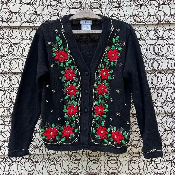 Vintage 90s B.P. Design Christmas Winter Holiday Ugly embroidered beaded poinsettia cardigan sweater cotton ramie blend size small flat measurements are approximate pit to pit 20 1/2 inches shoulder to hem 22 inches shoulder seam to wrist 22 1/2 inches preowned good condition but there is a heavy snag on a wrist cuff