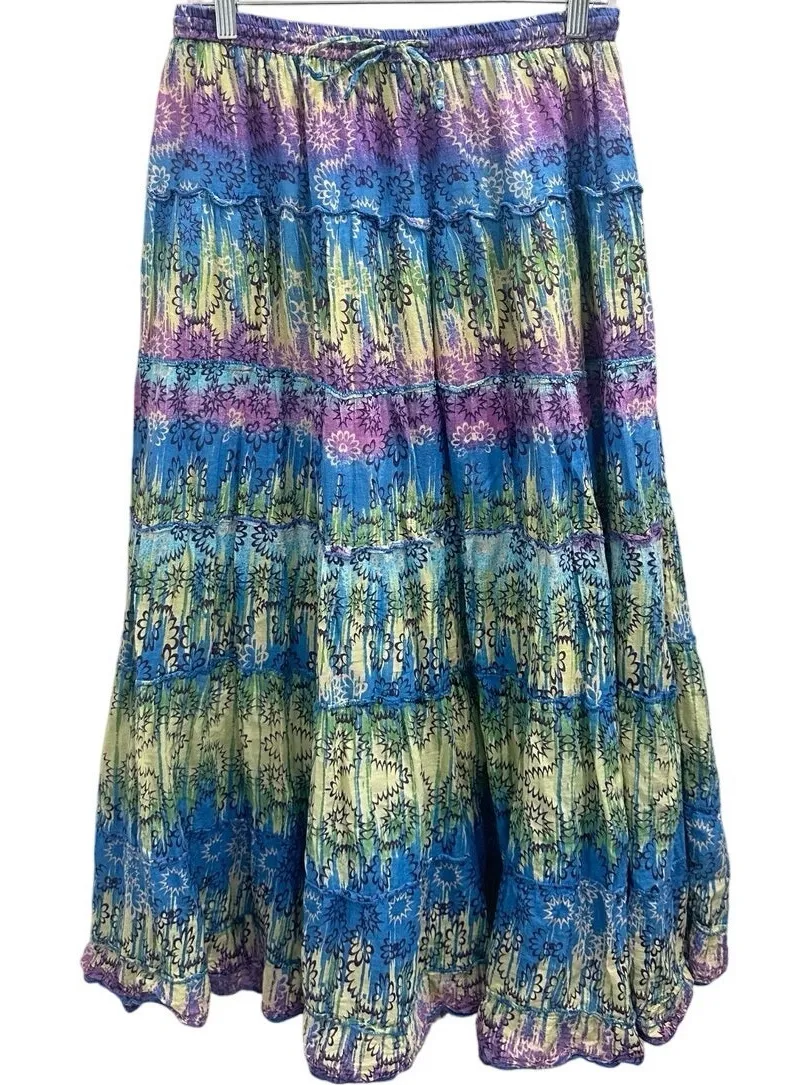 Condition: Excellent pre-owned condition; gently worn with no visible flaws *Royal blue also available. Bundle to save* Features: Vibrant bohemian tiered maxi skirt with multicolor floral and abstract batik-style pattern; elastic drawstring waistband for adjustable fit; fully lined with lightweight cotton for comfort and modesty; flowy, full silhouette for movement Size: L Color: Blue / Green / Purple multicolor Materials: 100% Cotton Texture: Soft lightweight crinkled cotton with smooth cotton lining Care: Hand wash cold, line dry Fairycore, fairy, whimsical, mermaid, siren, dreamy, sheer, nymph, fae, faerie, earthy, romantic, mystical, winx, gypsy, boho, Coachella, festival, free spirit, vibrant, bohemian, flower child, hippie, retro, resort wear, resortwear, vacation, relaxation, beach, flowy, breezy, tropical, cruise, coastal, summer, island, exotic, global, travel, getaway, beachy, leisure, cottagecore, cottage, prairie, peasant, country, frolic, meadow, 90s, y2k, aughts, 00s, 2000s style, ren faire, renn faire, renaissance faire