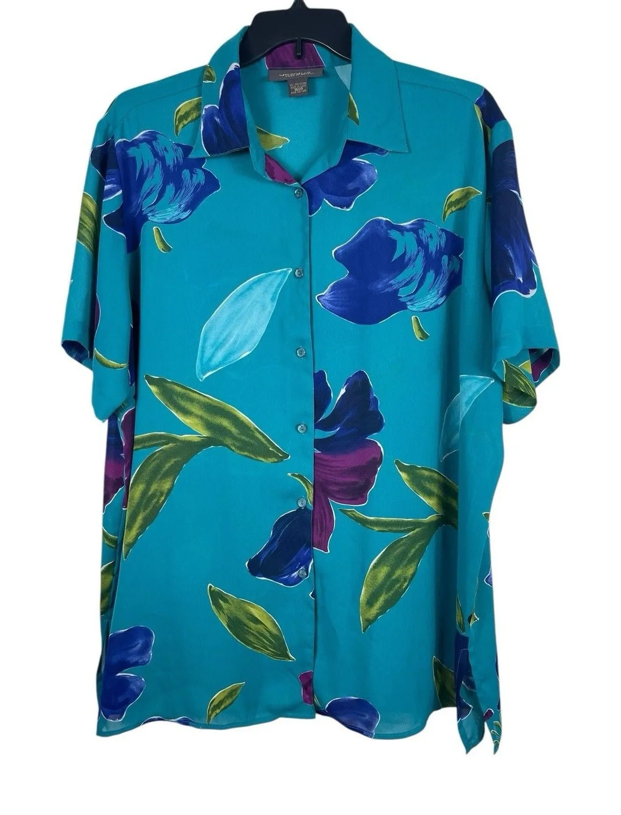 This VTG 90s Lane Bryant Designs blouse features a tropical teal floral print, perfect for travel, c... Show more