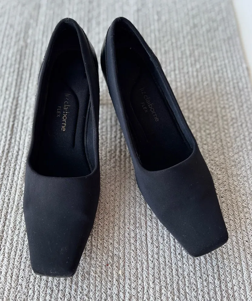 Vintage 90’s Liz Claiborne flex black fabric heels pumps. Square toe. Minimalist style. Stretch fabr... Show more