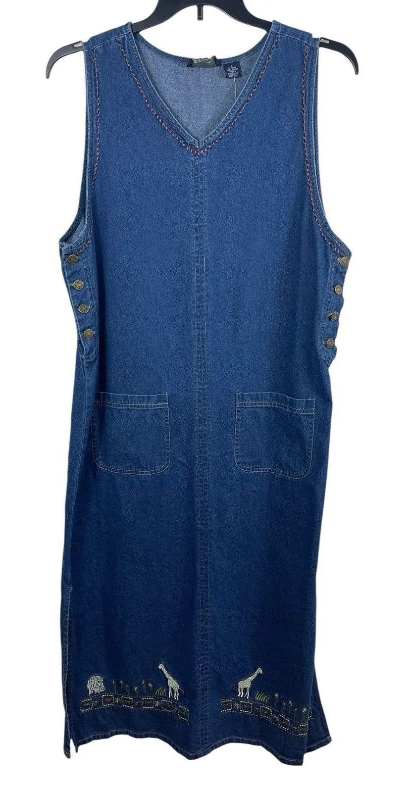 This VTG 90s M.P.H. Blues Denim Jumper Dress in size L is a whimsical and playful piece with embroidered animal safari pockets, perfect for casual or travel occasions. The sleeveless dress features a V-neckline and button closure, made from 100% cotton denim in a solid blue color. The overall midi length dress includes beaded accents and embodies a mix of vintage, Y2k, and farmhouse styles with a touch of modesty and charm. Ideal for the summer, fall, and spring seasons, this dress is a unique and eye-catching addition to any wardrobe.