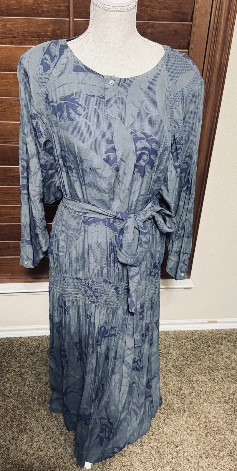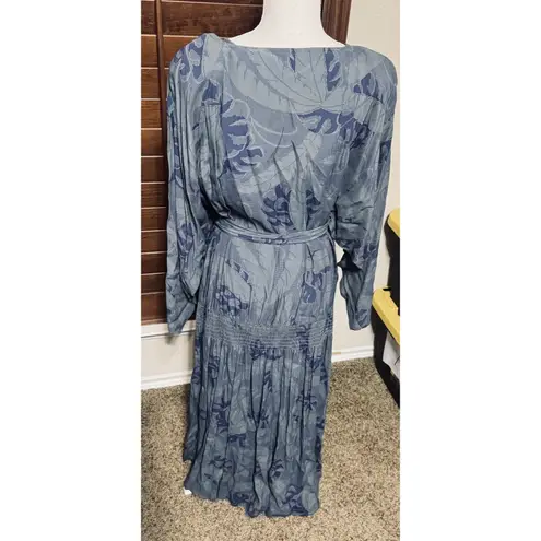 Nicole Miller vintage leaf print rayon modest dress, long sleeve smocked waist with tie belt longer... Show more