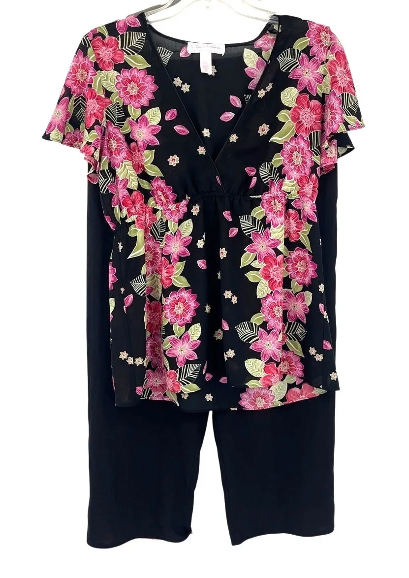 Black Oscar De La Renta Pink Label Floral Print Capri Pant Babydoll Top Pajama Set 90s Cottagecore P... Show more