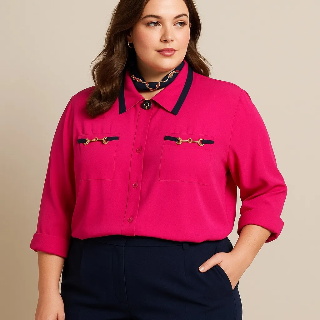 Vtg 90s Pride & Joy Button Top Equestrian Preppy Heritage Gold Bit 1980 **The model photo is computer generated. Please look at all photos for accurate details**. Gold-tone equestrian bit hardware accents on the chest pockets Contrasting navy trim along the collar and pocket edges Hidden button placket with statement gold/navy button at neckline 3/4 Rolled sleeve cuffs Lightweight acetate-rayon blend with a slight sheen New Old Stock Size 22W 62% Acetate, 38% Rayon Approximate measurements in inches: Pit to pit: 28 Shoulder to hem: 26 Sleeve length (from underarm): 21.25 Preppy, Equestrian, 80s Vintage, 90s Vintage, Statement Blouse, Barbiecore, Bold Color, Dressy Workwear, Power Dressing, Retro Glam, Vintage Plus Size, Classic American Style, Gold Hardware, Heritage-Inspired, Country Club, Coastal Grandma, Maximalist, Loud Luxury