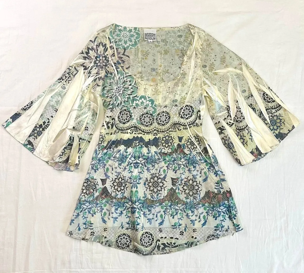 vintage 90s roxbury clothing co boho floral abstract print top with big flare bell sleeves, size small dress paper tags & made in USA means its vintage!! in very good condition, no noticeable flaws MEASUREMENTS: pit to pit 15in flat across, length 27in #boho #vintage90s #fairycore #whimsigoth #hippie