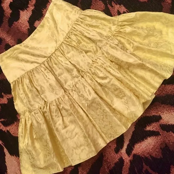 Vintage 90s tiered ruffle fairy cottage core skirt. Full circle skater shape, midi knee length. Frilly tiered ruffles in embossed silk blend in leopard cheetah animal print. Designer: Valentino, gold stitched label matches 90s style. Size 40/4. GUC, minor fraying on one seam. Flat: 14.5” W 17.75” high hip, then free 22” L fairy kei Mori girl Yume Kawaii Harajuku