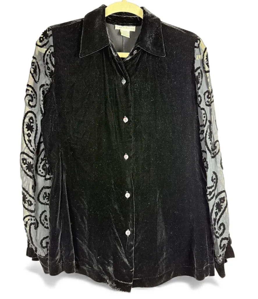 The VTG 90s Y2K The Limited Black Velvet Burnout Top is a stylish and versatile piece for women size medium. Made from a luxurious blend of silk and rayon, this long-sleeve top features a whimsigoth witchy design with a solid/paisley pattern in black velvet fabric. The collared neckline and button closure add a touch of sophistication to this vintage-inspired tunic, perfect for grunge, 90s, and gothic-themed outfits. Whether you're looking to add a unique statement piece to your wardrobe or channel your inner witchy vibes, this top is sure to make a statement.