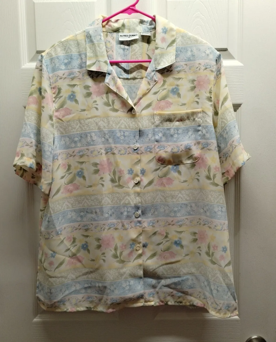 VTG Vintage Alfred Dunner Women's Size 18 Pastel Pink Floral Yellow Blue Button Up Shirt Great preowned condition, see photos. 24 1/2 inches pit to pit. 28 1/2 inches long. 100% polyester. Shoulder pads. Short sleeves. One chest pocket.