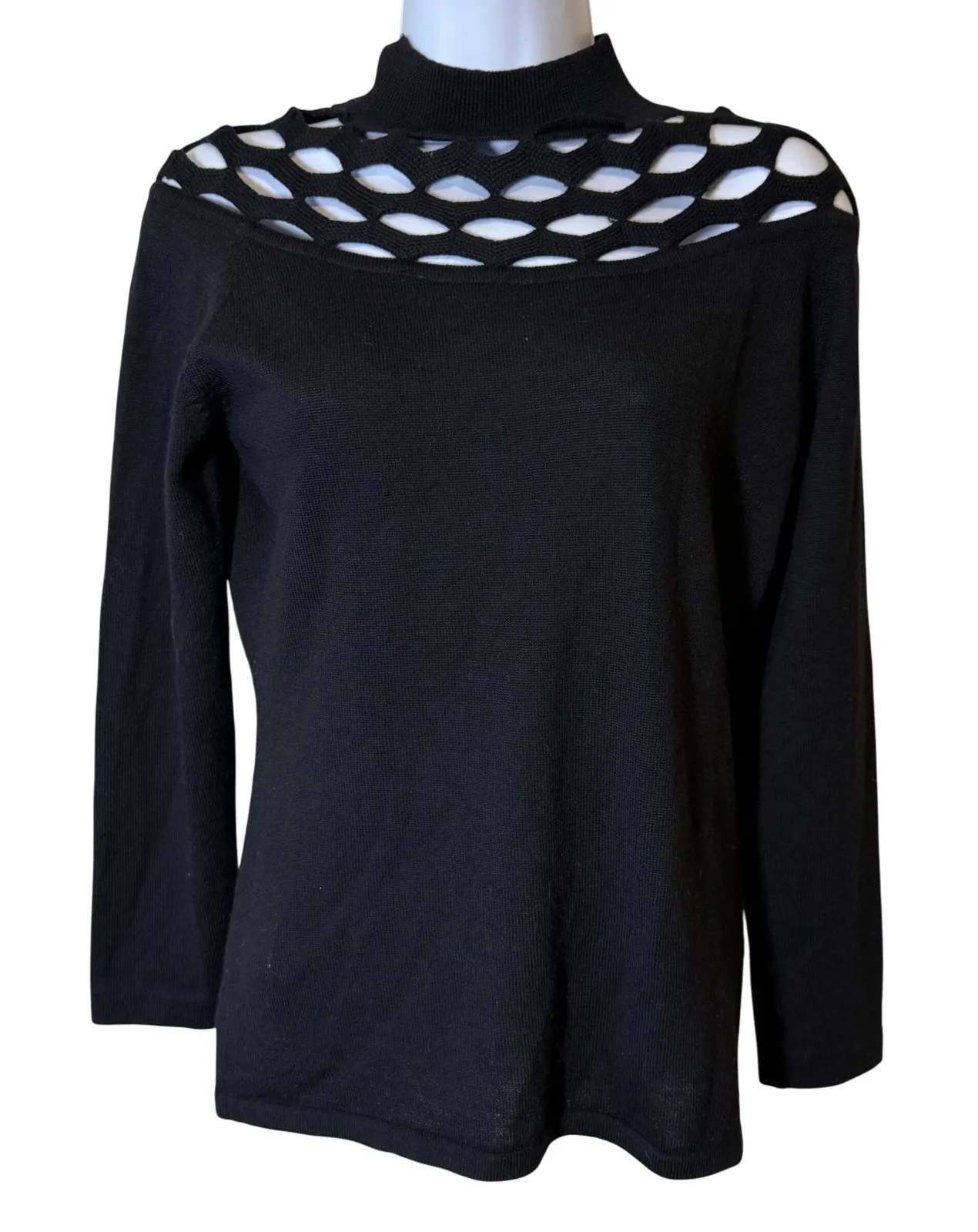 Command attention in this sophisticated Anne Klein II knit sweater. The elegant mock neck and unique cutout shoulder design add a touch of modern flair to this timeless piece. The soft knit fabric feels luxurious against the skin, offering both comfort and style. With its flattering silhouette and versatile color, this sweater effortlessly elevates any ensemble. Perfect for a chic office look, a stylish date night outfit, or a sophisticated evening gathering. Style: Pullover Department: Women Material: Wool Blend Sleeve Length: Long Sleeve Theme: Classic Type: Sweater Neckline: Mock Neck Features: Shoulder Pads Pattern: Solid Fabric Type: Knit Keywords: Anne Klein II, Black Sweater, Knit Top, Mock Neck, Cutout Shoulders, Small Petite, Long Sleeve, Women's Fashion, Elegant Sweater, Classic Style, Designer Sweater, Office Wear, Evening Wear, Date Night Outfit,wool,
