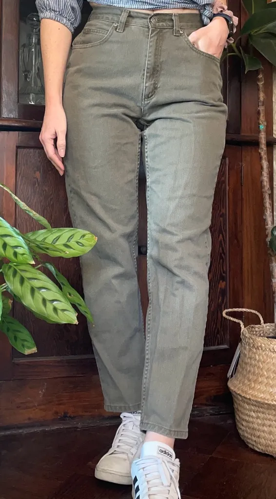 90s vintage Liz Claiborne army green mom jeans classic fit. Perfect fitting Liz Claiborne slim straight high rise jeans in an earthy army greenish brownish gray. Excellent fit for curvy 26s. Might fit super snug 27s. Sort of a wedgie fit.