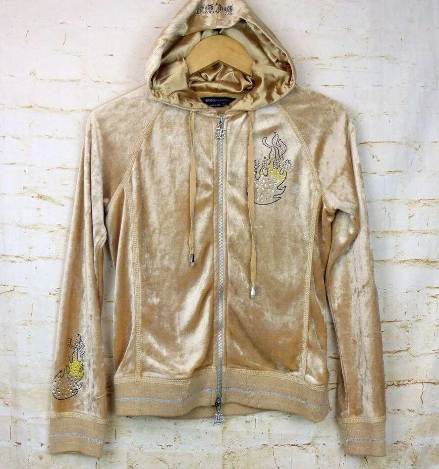 Pre-owned, Vintaget BCBGMAXAZRIA Y2K Velour Hoodie Track Jacket M Beige Rhinestone Graphic Flame. Lo... Show more