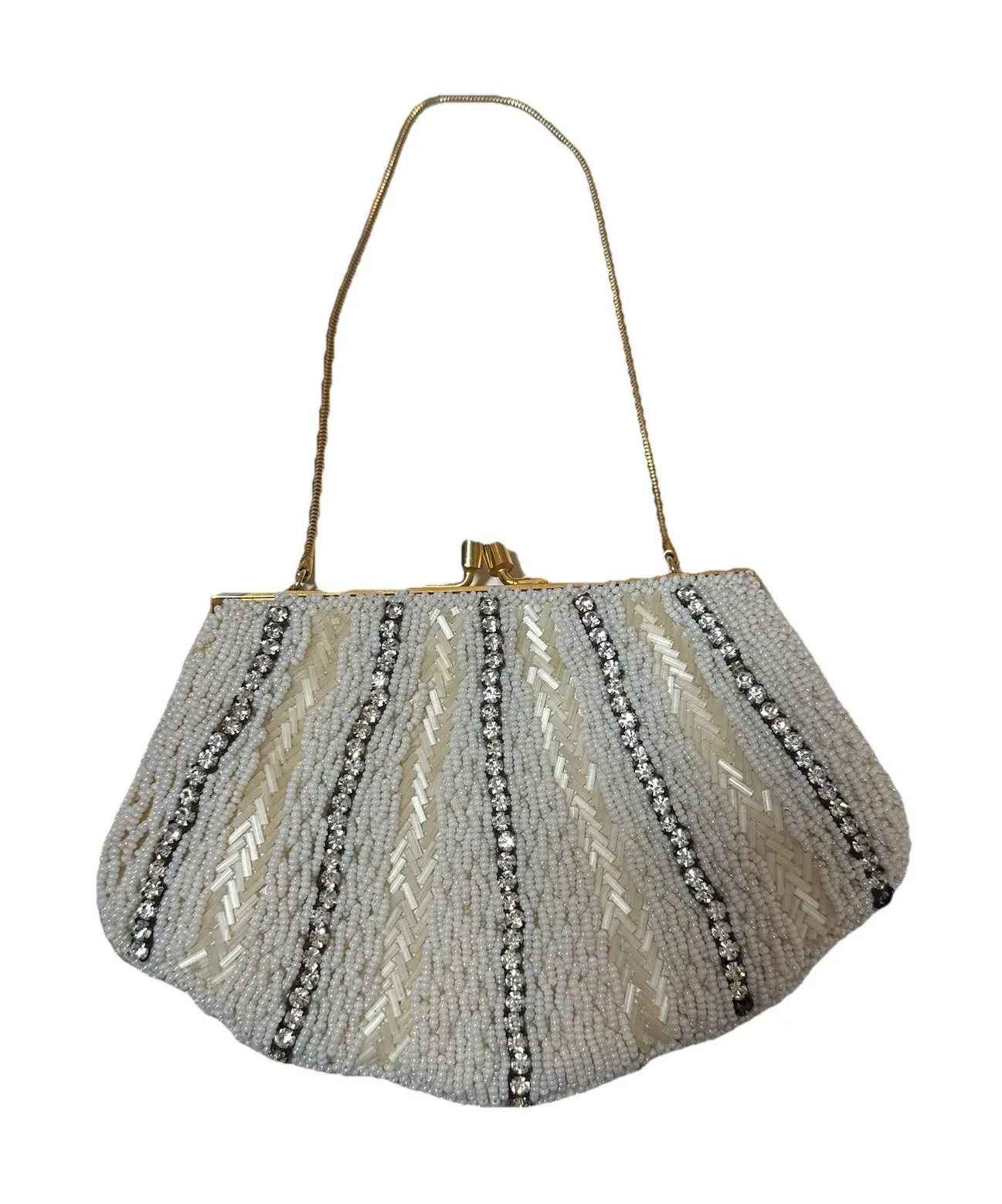 Vintage Glass Beaded La Regale Clam Shell Pinch Style Evening Cocktail Party Purse Clutch 1950's Overall Great Condition! Missing 4 Rhinestones (2 on Front, 2 on Back) Near the Bottom Seam * Kiss Lock Closure * Goldstone Chain Strap, Can Be Tucked Inside to be Used as a Clutch * Measurements are Approximately 5.5" wide (top), 7.5" wide (bottom); 3.5" tall (on ends), 4.75" tall (middle)
