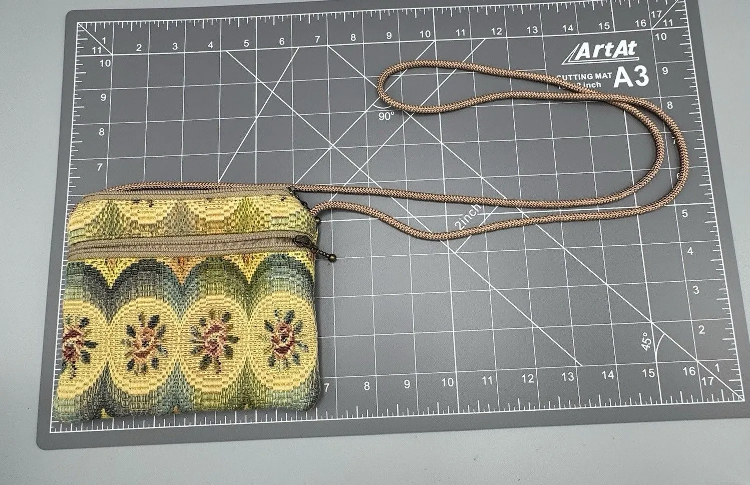 Color: multi Features: woven/tapestry outer fabric, floral Approx. Measurements: Length: 6 in (15.24 cm) Width/depth: 1 in (2.54 cm) Height: 5.5 in (13.97 cm) Strap Length: 22 in (55.88 cm) In good vintage preowned condition Gently used/displayed but not abused Slight ware (see photos) No rips, tears, or repairs