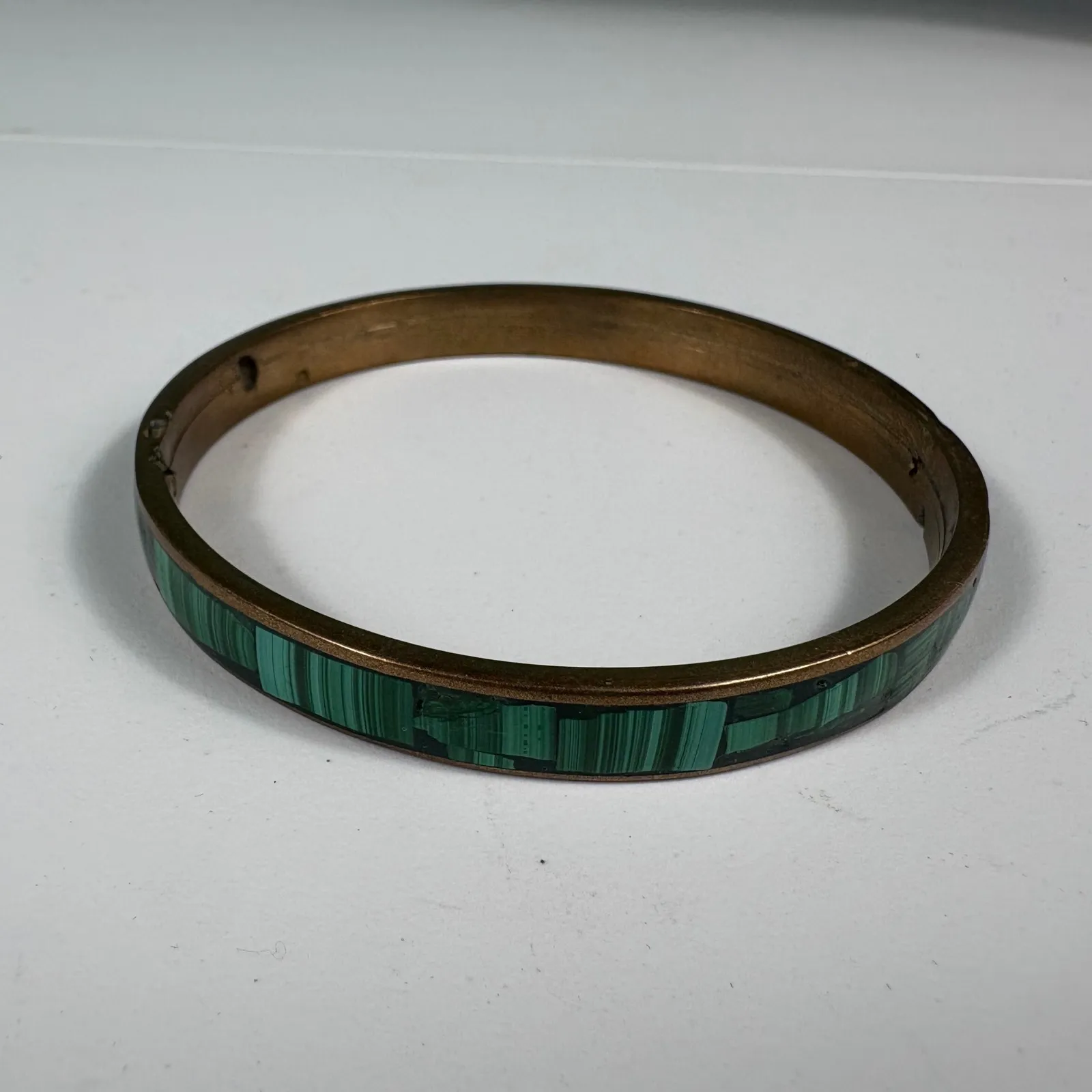 Vintage brass bangle bracelet featuring a malachite-style resin inlay. The vibrant green marbled des... Show more