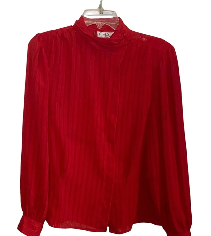 Chic red blouse with a high collar and long sleeves. the subtle pin striping us black and a metallic thread adding a nice detail . has a sheer quality . can be styled in so many fun ways . with jeans and heels w/ overalls , jean skirt , or professional attire with a trouser a blazer . buy it also says holiday party with a wide leg jean & a high heel . or a sleek trouser so many chic styling options size says 16 but it’s not a current 16 so it’s listed as a 12 which is more accurate , but refer to measurements c041725 21 inches pit to pit 40 inch waist 25 inches long wedding guest 23.75 inch sleeves vintage blouse , secretary blouse , 70s top , 80s blouse , professional, business, holiday attire , party attire , steam punk