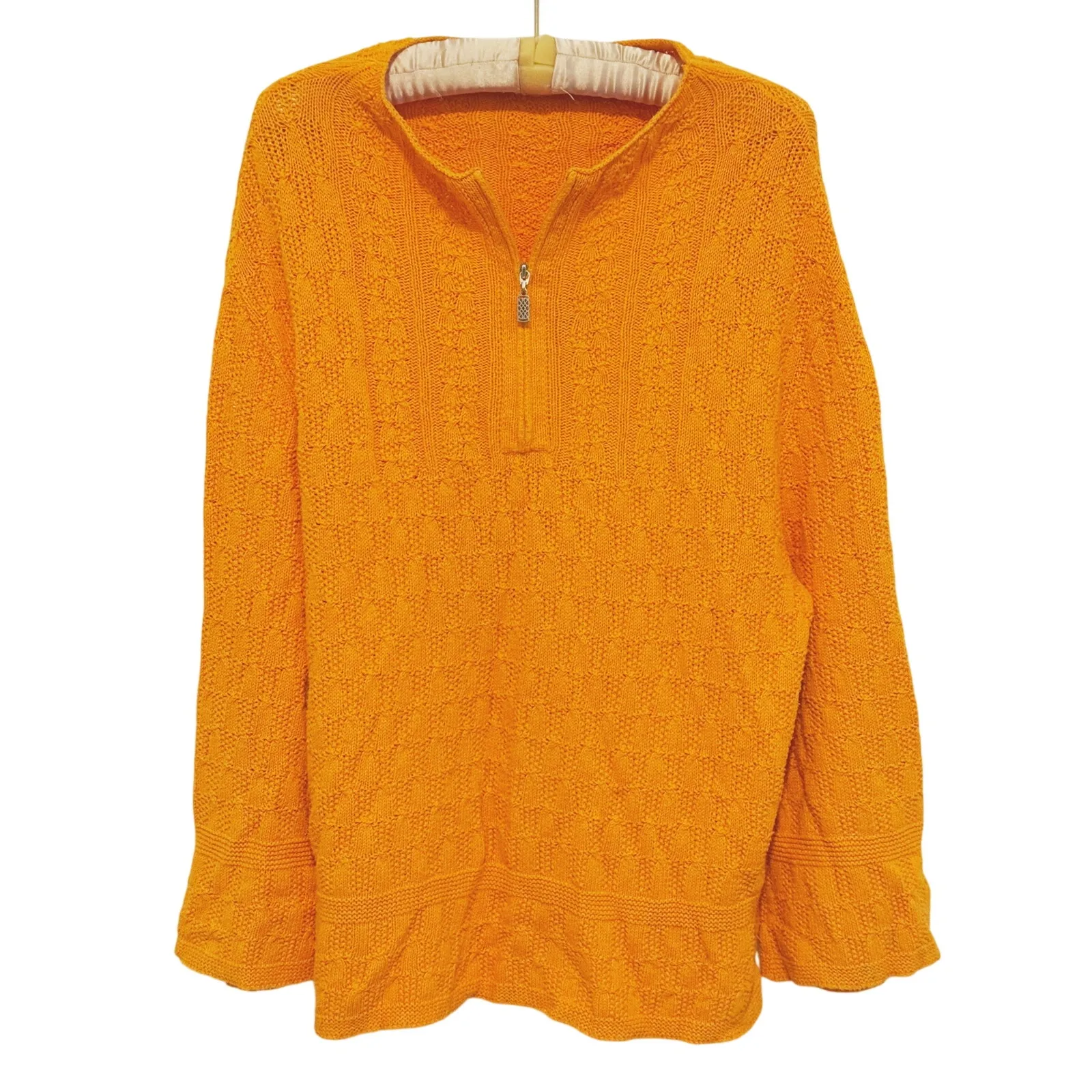 boho vintage, 1970s inspired, mediterranean, artisan knit, sunwashed, cozy statement, retro warmth Striking Coldwater Creek cable knit sweater in a rich marigold hue with a textured, sunwashed finish. This quarter-zip pullover features intricate knit detailing throughout, giving it a warm, artisanal feel reminiscent of 1970s bohemian and Mediterranean-inspired styles. A cozy yet statement-making piece that layers beautifully for fall and winter or stands out on its own with vintage character. • Brand: Coldwater Creek • Color: Marigold / Golden Yellow • Pattern: Cable knit textured design • Style: Quarter zip sweater • Size: Women’s Large (based on measurements)