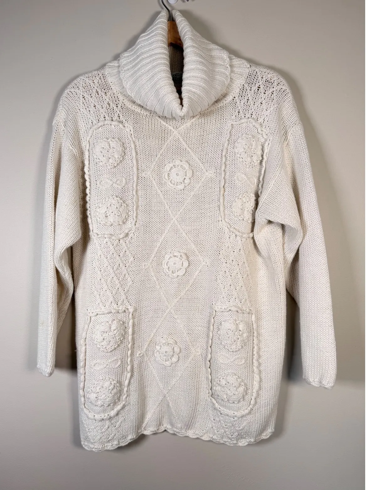 Colleens Collectables ivory chunky knit sweater tunic dress. This garment features a cozy turtleneck collar and a relaxed fit. Intricate cable knit detailing and decorative floral appliques adorn the front, with two functional patch pockets adding to its charm. The textured knit and unique embellishments create a visually appealing and tactile design. Style: Tunic Department: Women Material: Wool Blend Neckline: Cowl Neck Theme: Bohemian Sleeve Length: Long Sleeve Type: Sweater Features: Pockets Pattern: Geometric Fabric Type: Knit Accents: Crochet Knit Style: Cable-Knit Season: Winter, Fall Fit: Relaxed Occasion: Casual Garment Care: Dry Clean Only Unit Type: Unit Keywords: chunky knit, turtleneck, ivory sweater, cable knit, floral applique, patch pockets, tunic dress, cozy, textured knit, vintage knitwear, statement sweater