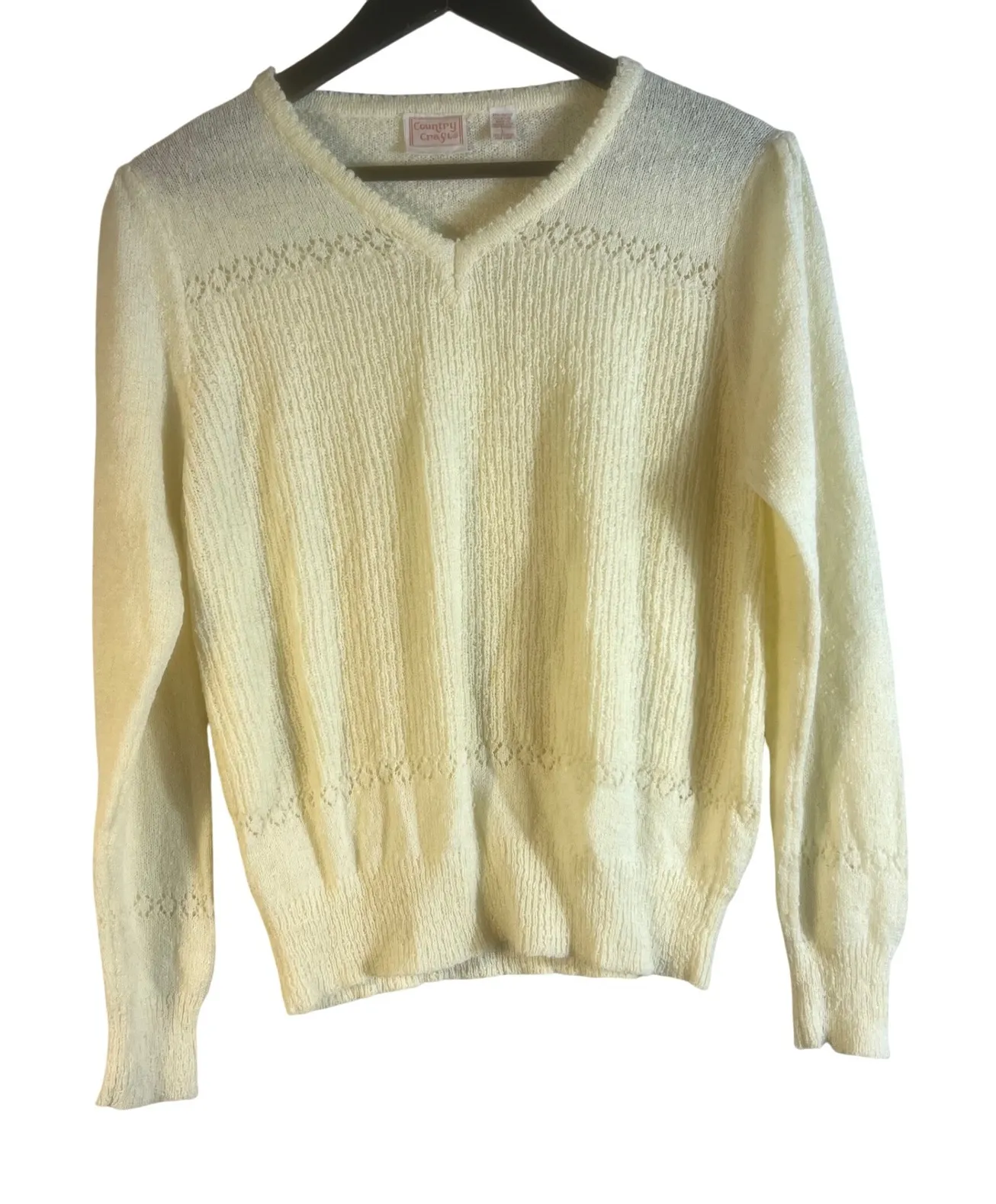 This vintage Country Craft women's sweater is a soft pale yellow knit featuring a V-neckline and subtle textured pattern across the chest and hem. Made in Taiwan R.O.C., it reflects classic vintage quality and style from the late 80s–90s era. Crafted from a cozy acrylic/nylon blend, it's lightweight yet warm, perfect for layering. A charming retro piece that pairs well with jeans, skirts, or trousers for a timeless casual look. Condition: Pre-owned with some minor discoloration on the shoulder (see last photo). No major flaws—still very wearable and stylish. Shipping: Fast shipping with care. • Color: Pale Butter Yellow • Style: Pullover Sweater • Neckline: V-Neck • Sleeve Length: Long Sleeve • Material: 85% Acrylic, 15% Nylon • Made in: Taiwan R.O.C. (indicates vintage) • Condition: Pre-owned, some light wear noted (slight discoloration on shoulder – see photo), overall good vintage condition Measurements (approximate, laid flat): • Pit to Pit: 21.5" • Length: 24"