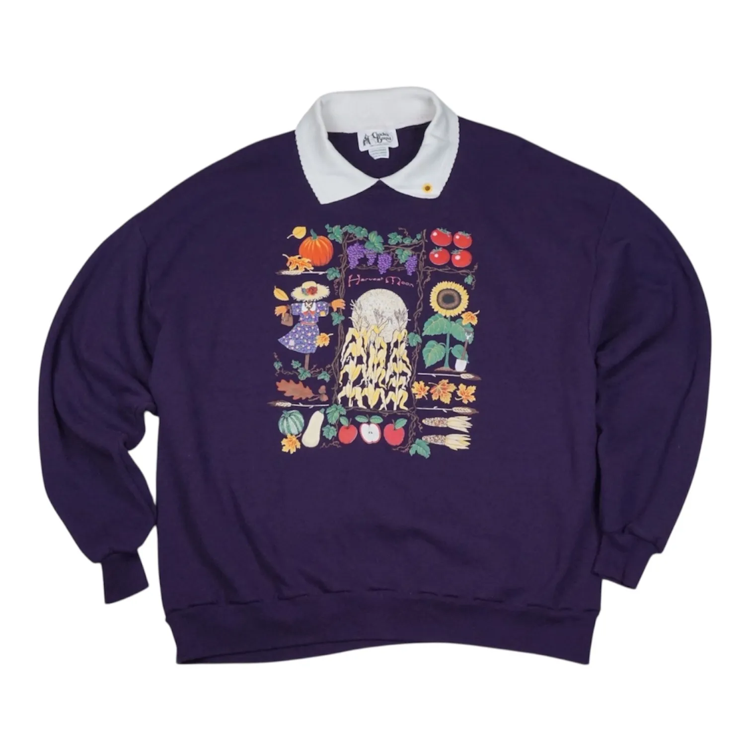 Late-90s Cracker Barrel "Harvest Moon" collared sweatshirt with a cozy folk-art harvest graphic featuring pumpkins, corn, apples, grapes, sunflowers, and a scarecrow scene. Deep purple base paired with a white ribbed collar and subtle embroidered sunflower detail gives it that warm farmhouse, cottagecore feel. Made in the USA from a soft cotton-poly fleece. Size: Adult 2XL Measurements: Pit to Pit: 26" Length: 28.5" Sleeve: 23" Condition: Pre-owned, great overall condition with no major flaws. Print is vibrant and fabric is clean. Please review photos for full condition details. All items ship fast and come from a clean, smoke-free environment! Keywords: fall fashion, autumnal, seasonal, graphic sweatshirt, collared sweatshirt, oversized fit, retro, country style, harvest print, womenswear, cozy, casual wear, cottagecore, cabincore