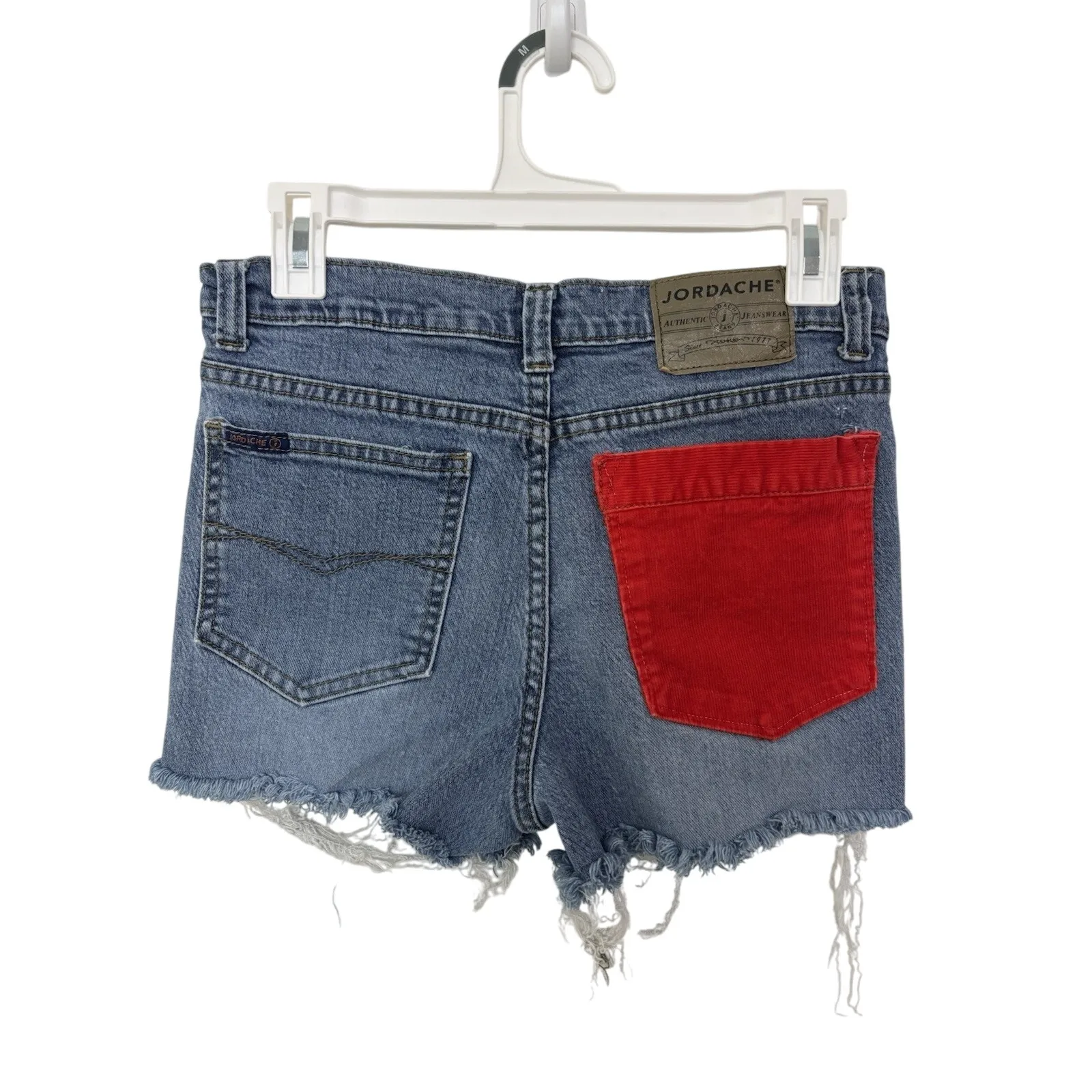 Vintage 90s Jordache Denim Cut Off Shorts Women’s Size 7/8 Waist 14” Length 11” Inseam 2” In good vintage condition - small hole in rear near red pocket (pictured A red corduroy pocket was added to the back of the shorts Cotton Spandex Blend Vintage denim, 90s shorts, 90s jeans, 90s denim, festival, summer, vacation, cut off shorts, western, cowgirl, rodeo, coastal cowgirl R017