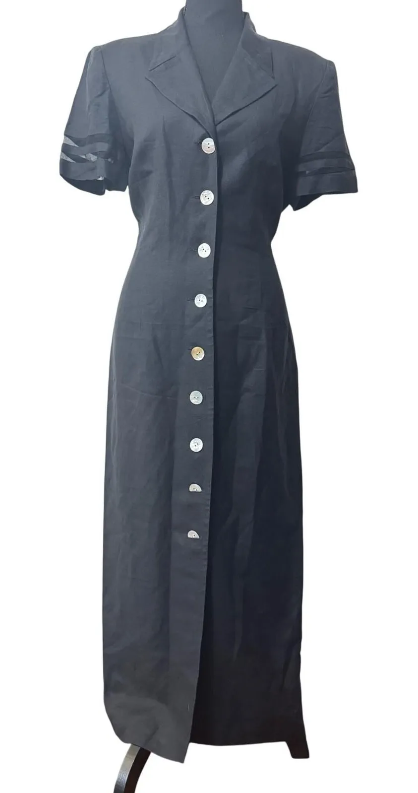 Discover timeless sophistication with this Cynthia Howie for Maggy Boutique maxi dress. Crafted from a breathable linen blend, this elegant piece features a flattering button-front silhouette and chic short sleeves adorned with subtle sheer detailing. The meticulously pleated back adds a touch of refined detail, while the lustrous mother-of-pearl buttons offer a luxurious finish. Perfect for a sophisticated brunch, a garden party, or a stylish evening out. Style: Shirt Dress, Jacket Dress Dress Length: Long Department: Women Sleeve Length: Short Sleeve Pattern: Solid Occasion: Workwear, Business, Casual Material: Linen, Rayon Fabric Type: Woven Neckline: Collared Season: Summer, Spring Sleeve Type: Slit Sleeve Closure: Button Accents: Pleated, Button Features: Collared Keywords: linen dress, button front dress, black maxi dress, short sleeve dress, pleated back dress, mother of pearl buttons, classic dress, summer dress, resort wear, elegant dress, day dress, midi dress, tailored dress