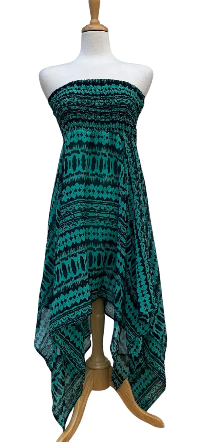 Brand: DEB Size: Medium Material: 100% Polyester Color: Teal and black with geometric print Style: Y2K, whimsygoth, fairy grunge, boho, asymmetrical, Lightweight Fit: thick smocked bustline with handkerchief hemline. Sheer chiffon fabric with mini length lining. Pull on. Strapless, asymmetrical Measurements are approx. and taken lying flat. Chest 11” with considerable stretch. Length waist to hem 28.5” at the shortest point. Sides drape down longer. Ships from a smoke free, pet friendly home. Steam cleaned prior to listing. Condition notes: good vintage condition. No notable rips, stains or tears. Photographed in natural light. Color may vary under different lighting conditions. Please see images for exact condition, Happy to send more details if requested! Offers welcome.