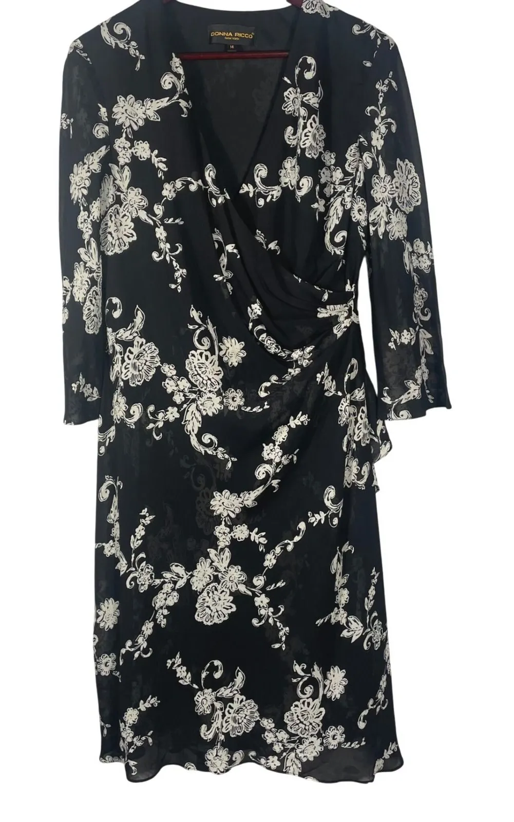 Elegant and timeless Donna Ricco New York dress in a classic black-and-white floral print. This women's size 14 dress features a flattering draped front detail, sheer sleeves, and a fully lined body for comfort and coverage. Perfect for cocktail parties, formal events, weddings, or evening wear. • Color: Black with white floral print • Style: Midi sheath dress with draped front • Draped surplice neckline • Sheer long sleeves • Fully lined body • Side zipper closure • Lightweight chiffon overlay with elegant floral scroll print • Fabric Care: Professionally dry clean only • 100% Rayon, Lining: 100% Polyester • Measurements (approximate, laid flat): • Pit to pit: 17.5" • Waist: 15.5" • Length: 45" • Made in USA • Condition: Pre-owned, excellent condition with no visible flaws. cocktail, wedding guest, evening sheath, formal party outfit, classic black white floral, semi-formal event wear, draped chiffon