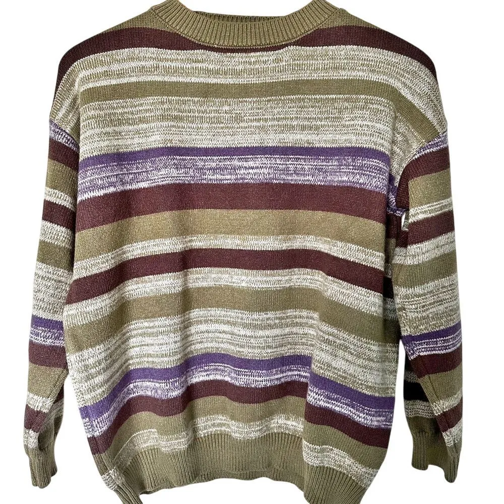 This vintage rare Emmiol Striped Crew Neck Knit Sweater is in this seasons hottest color pistachio green and purple. Considered the new neutrals you will be warm and cozy with this soft cotton knit. Please review the dimensions below for fit as there are no size tags; however upon measuring it seems to fit as a size small. Dimensions (approximate) Shoulder Width:20.5" Pit to Pit: 22" Sleeve Length: 17" Length from Back: 22.5" Please review all photos prior to purchasing as items are shipped as is from a non-smoking/ pet free home. All clothing from my store is cleaned prior to shipping unless NWT.