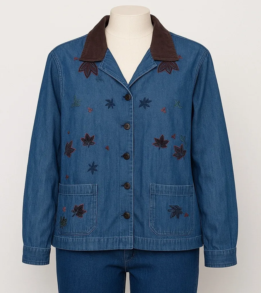 Perfect for layering in fall with jeans or leggings. Button-front denim jacket with embroidered autu... Show more