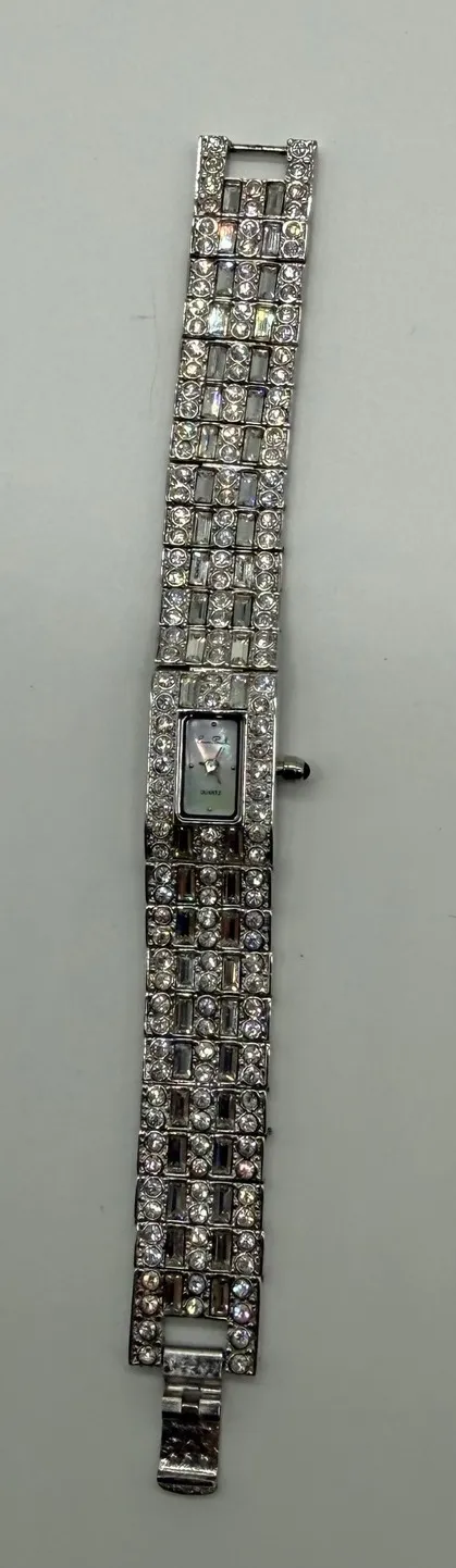 Vintage Elegant Erwin Pearl women's watch with a dazzling crystal-embellished bracelet. The rectangular face features a shimmering mother-of-pearl dial with simple hour markers and hands, and the watch is powered by a precise quartz movement. Its sparkling design makes it a perfect accessory for evening events, formal gatherings, or adding a touch of glamour to everyday wear. Very good used condition. Does need a new battery Department: Women Style: Luxury, Dress/Formal Features: Day/Date, Water Resistance Movement: Quartz Dial Color: White Type: Wristwatch Band Color: Silver Bezel Color: Silver Case Color: Silver Band Material: Stainless Steel Display: Analog Case Material: Stainless Steel Indices: Stick Indexes Watch Shape: Rectangle Keywords: Erwin Pearl watch, crystal watch, sparkling bracelet, dress watch, fashion watch, ladies watch, quartz movement, mother of pearl dial, glamorous, evening wear, formal accessory, statement watch, bijoux watch, vintage