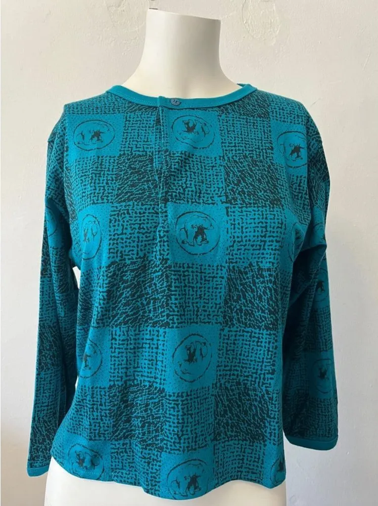 Size L made of a soft, lightweight polyester cotton blend material teal blue color with a black and white geometric pattern. a round neckline single button closure at the neckline Pullover style long sleeves and have a slight puff at the shoulder. good condition with no visible tears or stains. Ptp 16 inches Shoulder to sleeve 16 inches Length 20 inches Made in Hong Kong geometric preppy alternative rocker punk rocker