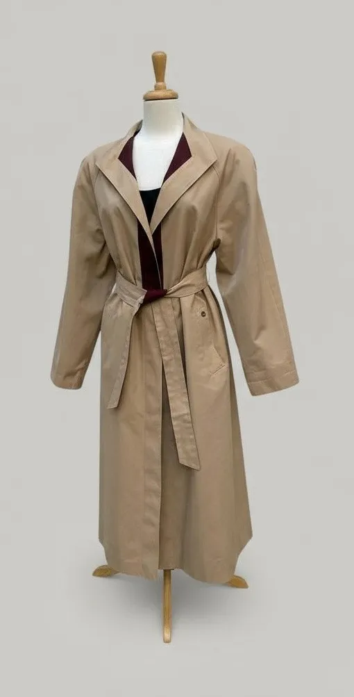 Brand: Etienne Aigner Size: 10P Material: polyester/cotton blend Color: beige/khaki with contrasting red/burgandy Style: classic, preppy, Careerwear, winter, minimalist Fit: no buttons, tie waist only. Tie included. Side pockets. Point collar, long length, padded shoulders. Measurements are approximate and taken lying flat. Pit to Pit 21” Shoulder to hem length 44” Sleeve length 23” Ships from a smoke free, pet friendly home. Steam cleaned prior to listing. Condition: good vintage/preloved condition. Lost stitching at the inseam of side pocket on red side. Slightest bit of discoloration at the wrist cuffs on the beige side. Photographed in natural light. Color may vary under different lighting conditions. Please see images for exact condition, Happy to send more details if requested! Offers welcome.