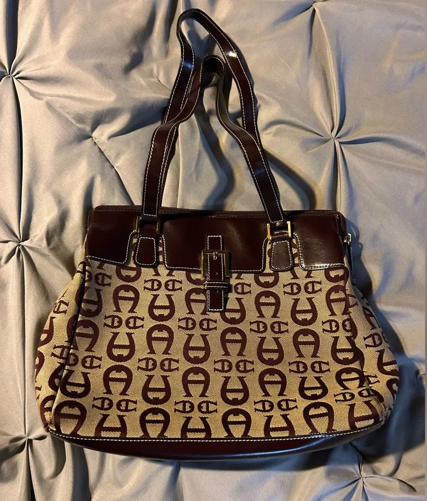 The product is a vintage Etienne Aigner tan brown logo fabric leather bag shoulder bag with a zip cl... Show more