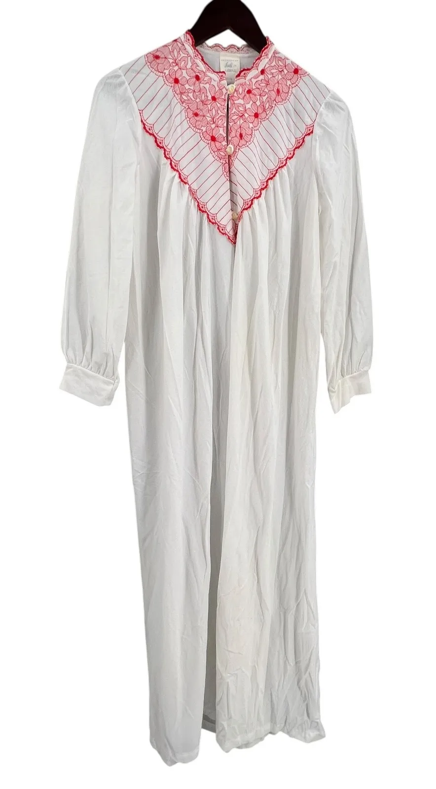 Beautiful vintage deadstock nightgown by Fashions by Juli. Crisp white with red embroidered detailing and scalloped neckline. Soft acetate blend fabric with a flowing ankle-length cut. Tag size Small Bust: 20" Length: 55" Sleeve: 23" In excellent deadstock condition, no flaws. Perfect for vintage lovers or cozy, romantic style. Keywords: vintage robe, Fashions by Juli LTD, white robe, red embroidery, floral robe, long sleeve robe, size S, womens robe, retro loungewear, acetate nylon robe, embroidered robe, vintage loungewear, robe, nightgown, sleepwear, cottagecore, romantic, modest