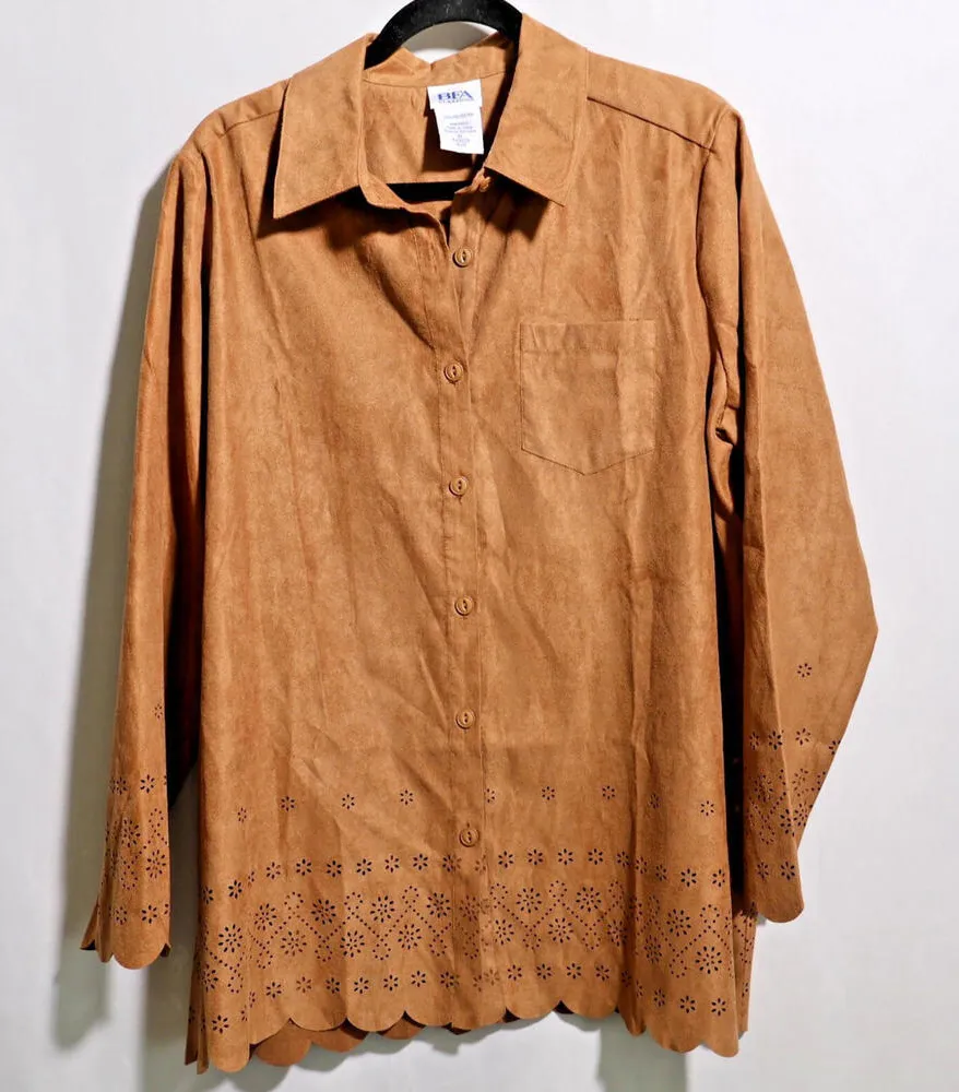 VTG Faux Suede Laser Cut Brown Button Up Western Top Shacket Rodeo Cowgirl XL womens vintage collare... Show more