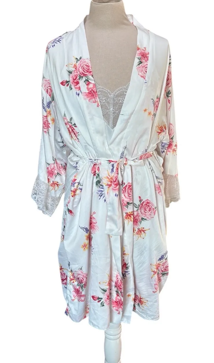 Great preowned condition, no holes or stains Robe Measurements Pit to pit: 23" Length: 38" Slip Measurements Pit to pit: 19.5" Length: 36" Keywords: satin robe, lace trim, floral print, sleepwear, loungewear, boudoir, bridal, delicate, feminine, cozy, kimono, nightgown, slip dress, y2k, lingerie Smoke-free, pet-free home. All items are washed/sanitized with hypoallergenic detergent and come ready to be worn! All measurements taken with item laying flat. Length is measured from shoulder to bottom hem. Bundle and save — check out my closet for more styles!