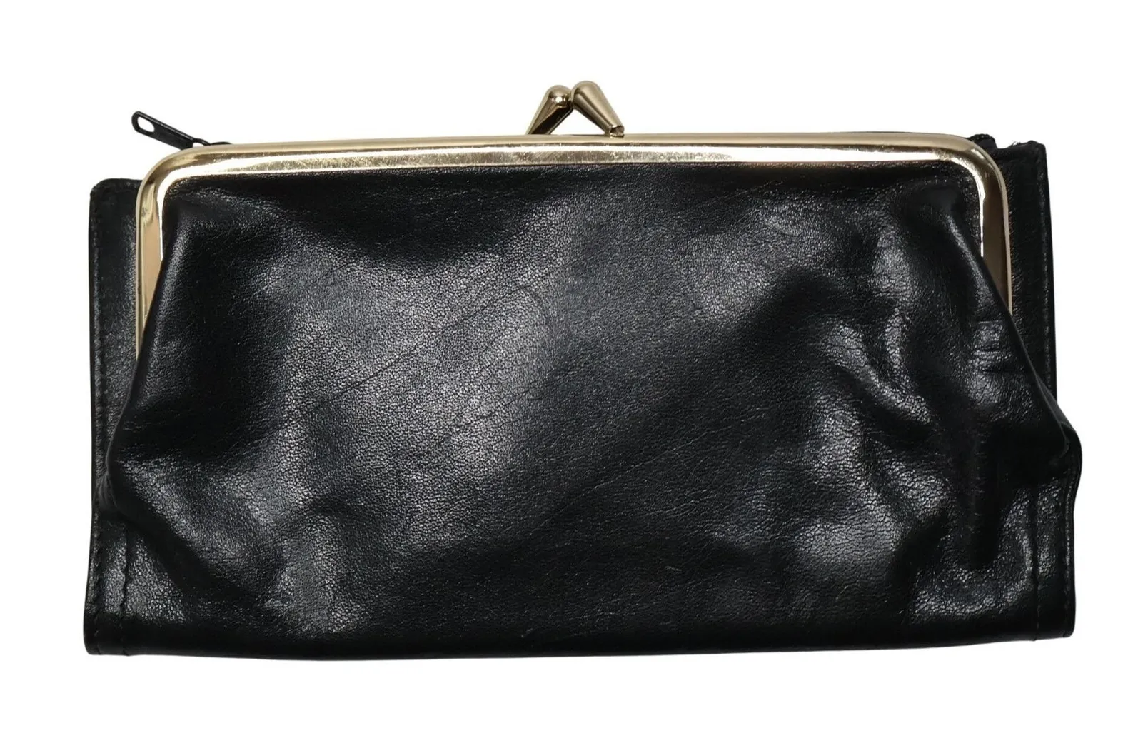 Keywords: clutch, wallet, leather, kiss lock, zipper, vintage, evening, formal, organizer, coin purse, card holder, black, fashion, accessory vintage classic chic brass gold hardware lined made in Korea Please see photos for details. Offers welcome!