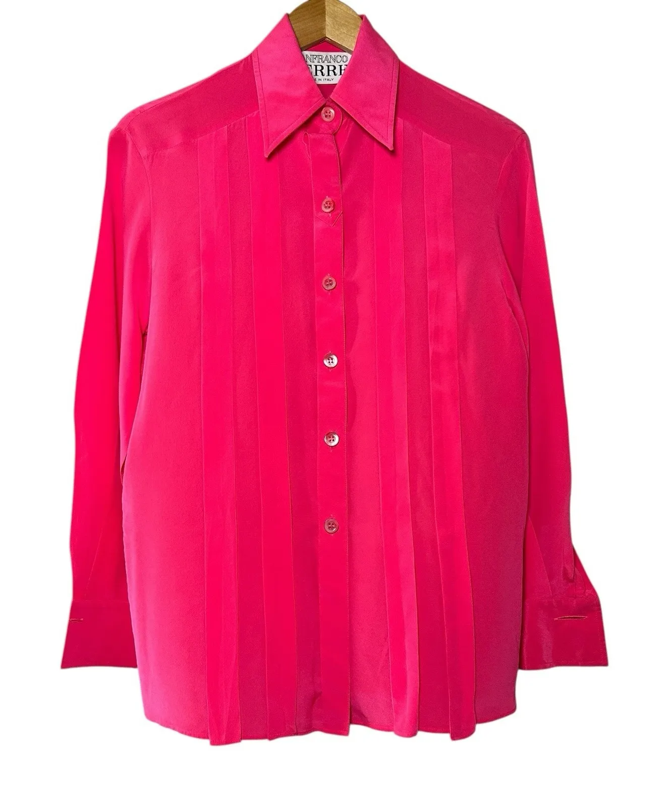 Condition: Excellent vintage condition with minimal wear Measurements: Chest 19.5" across Shoulder to Hem 27" Sleeve 22.5" Back 17" Not all clothing items will measure as expected, so please compare the measurements we provide with one of your favorite garments to ensure a correct fit. Stunning vintage Gianfranco Ferré button-up blouse in vibrant hot pink silk. Made in Italy, this luxurious top features structured pleats, a sharp oversized collar, and unique contrast black-and-coral cuff buttons—hallmarks of high 1980s designer fashion. Fully lined in rayon for added comfort. Italian size 40 (fits like a US 6). A true statement piece from the "Architect of Fashion" himself. • Brand: Gianfranco Ferré • Size: IT 40 (approx. US 6) • Material: 100% Silk (Shell), 100% Rayon (Lining) • Color: Hot Pink / Fuchsia • Era: Vintage 1980s–1990s • Features: Button-up, Pleated front, Statement collar, Contrast cuff button Style: 80s glam, power dressing, vintage designer, maximalist, bold color, Italian fashion, luxury silk, retro officewear, mob wife aesthetic