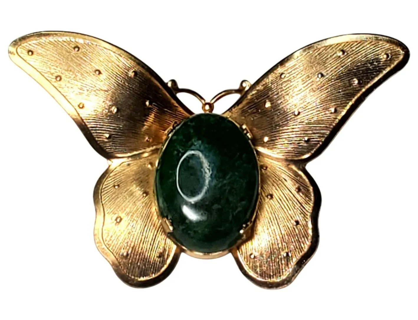 Vintage Green Agate Butterfly Insect Gold Tone Wings Brooch Pin 1.5 in Stone Body. The pin was preowned and is in good condition. Please view all pictures before purchasing. Item will be packed with care. Message me if you have any questions. Browse and save my store for antique and vintage collectibles. Reasonable offers are considered.
